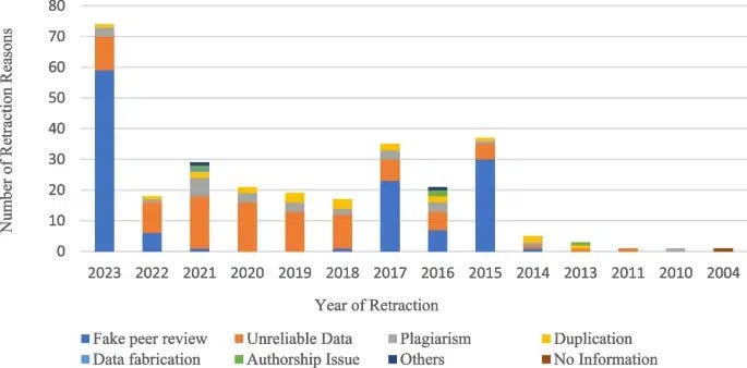 Of the 282 systematic reviews analyzed, the average time between publication and retraction was approximately 23 months, and nearly half of the non-Cochrane systematic reviews were retracted in the past four years. The most common reasons for retractions were falsification of peer reviews and the use of unreliable data.