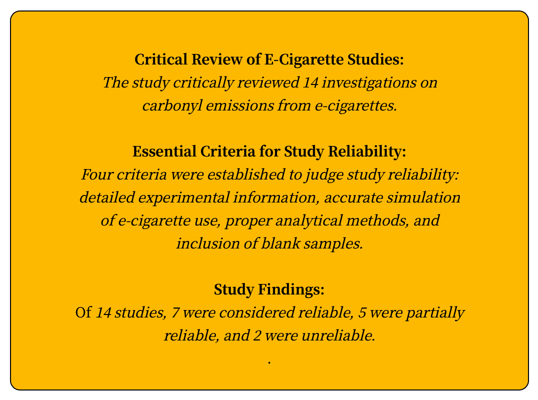 This particular review focused on 14 recent studies on carbonyl emissions, especially aldehydes, the most common toxic byproducts in e-cigarettes.