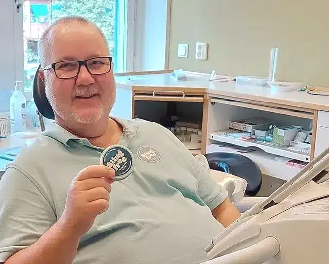 For five weeks, twenty-three Swedish dentists—habitual users of snus or pouches—were invited to replace their usual products with a newly designed pouch: the Stingfree Strong Blue Mint. Conceived with an internal semipermeable barrier made from plant-based materials, it was created by Swedish activist and inventor Bengt Wiberg to minimize direct contact with the gums and oral mucosa.